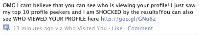 Applications like “Who Visited You” and others will pull in a list of your friends and write on their walls or update your status, pretending to be you and aiming to trick your friends into clicking the link.